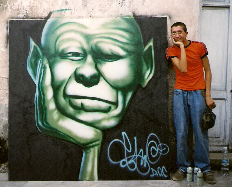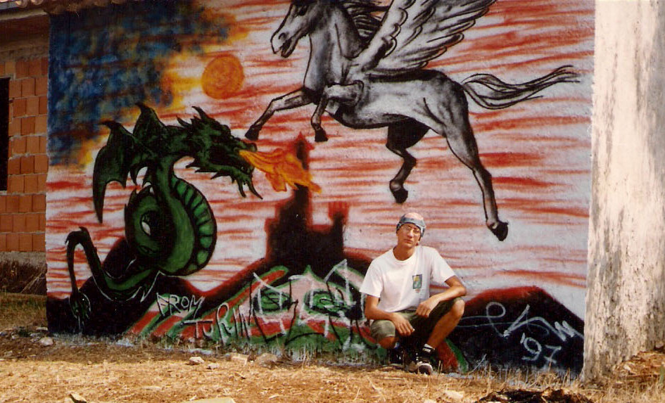 Fa sempre un po' fatica ad integrarsi con i coetanei di massa, e dai 12 anni inizia ad appassionarsi di StreetBasket, Skateboard, Hip-Hop e Graffiti, dipinge il suo primo graffito nel 1995 e viene anche beccato dalla polizia, continuerà a farne molti altri più di un centinaio, anche insieme a nuovi amici come quelli della Crew di cui farà parte la D.o.C. Crew con Deep e altri, e altri amici come Mimmo.
